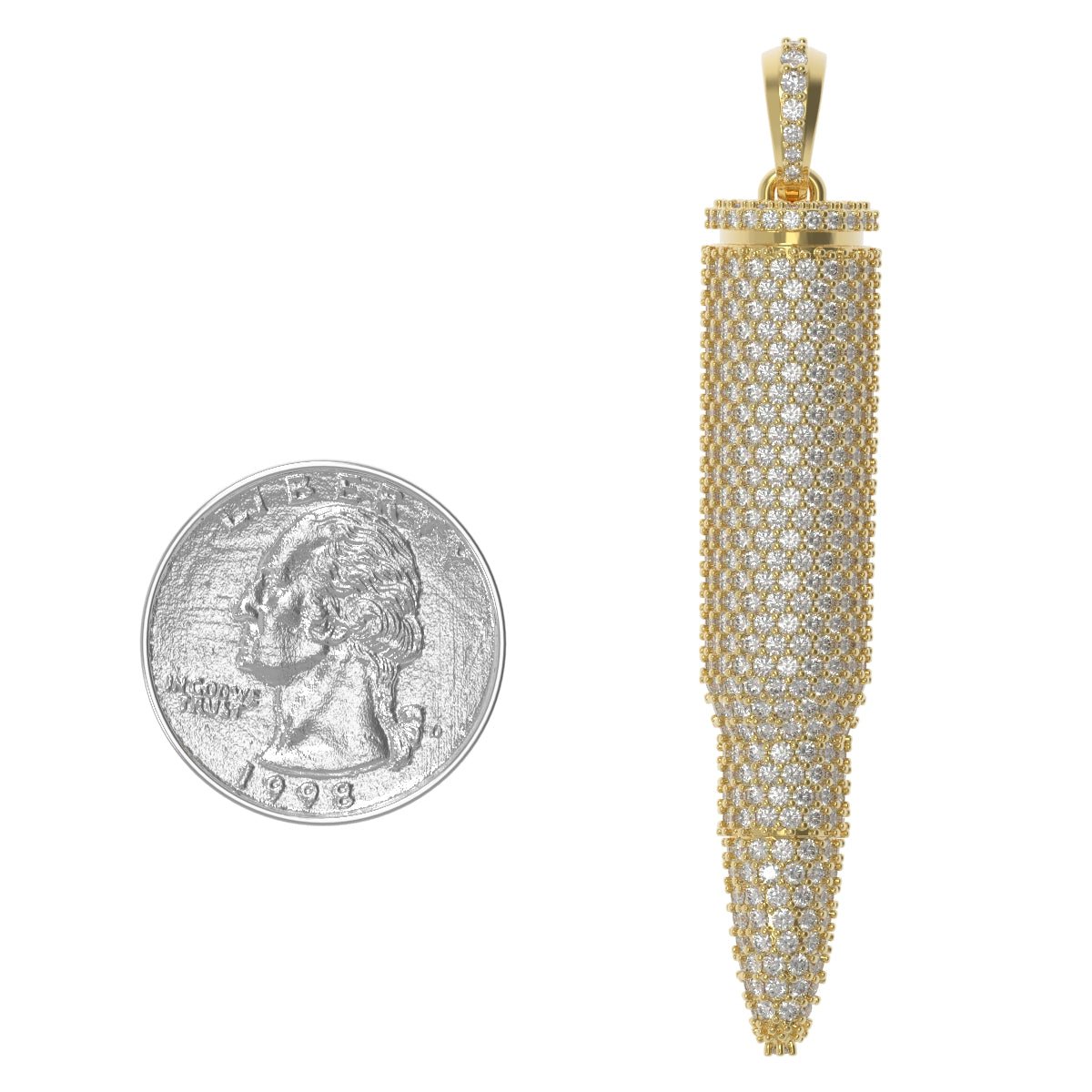 This luxurious bullet pendant screams sophistication with a dangerous edge. Expertly crafted, it is carved from solid 14k gold that is fully iced-out with sparkling pavé-set diamonds. When combined with a sleek chain, it makes the ultimate statement piece to level up your look.