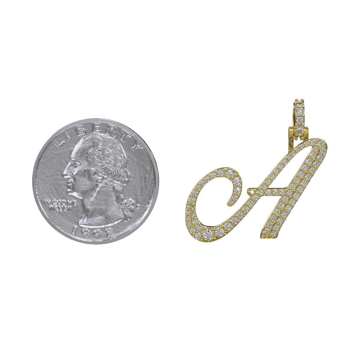 Manifest some bold self-expression with this iced-out 10k solid gold initial pendant. It is meticulously crafted into a sophisticated cursive font to give your look a luxurious edge. Combine it with a fresh Cuban chain to complete the look and layer up with other styles for a dramatic effect.